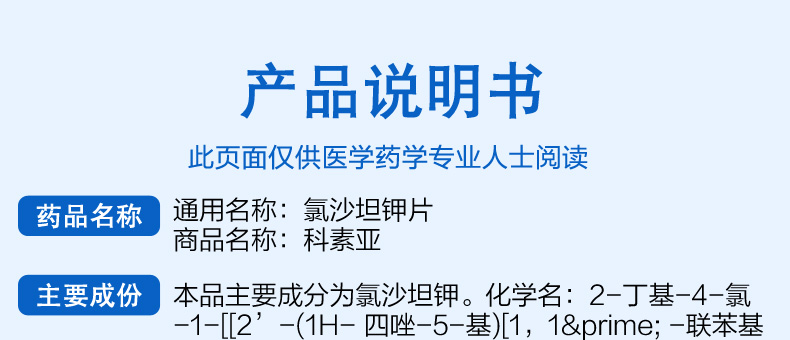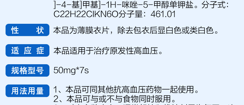 化学名称:2-丁基-4-氯-1-[[2-(1H- 四唑-5-基)[1,1联苯基]4基]甲基]1H咪唑5甲醇单钾盐。