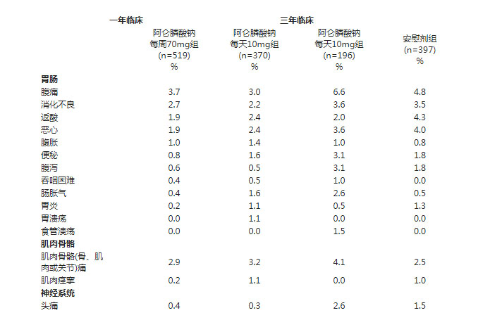 以下是研究者报告可能、很可能或一定与药物有关的不良事件,其发生于为期一年临床中任一组≥1%的病人中;或发生于为期三年临床中≥1%的接受每天阿仑膦酸钠10mg的病人且发生率高于安慰剂组。