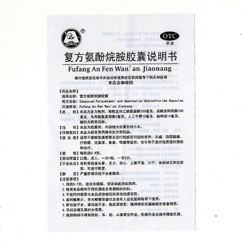 本品为复方制剂,每粒含对乙酰氨基酚250毫克、盐酸金刚烷胺100毫克、马来酸氯苯那敏2毫克、人工牛黄10毫克、咖啡因15毫克。