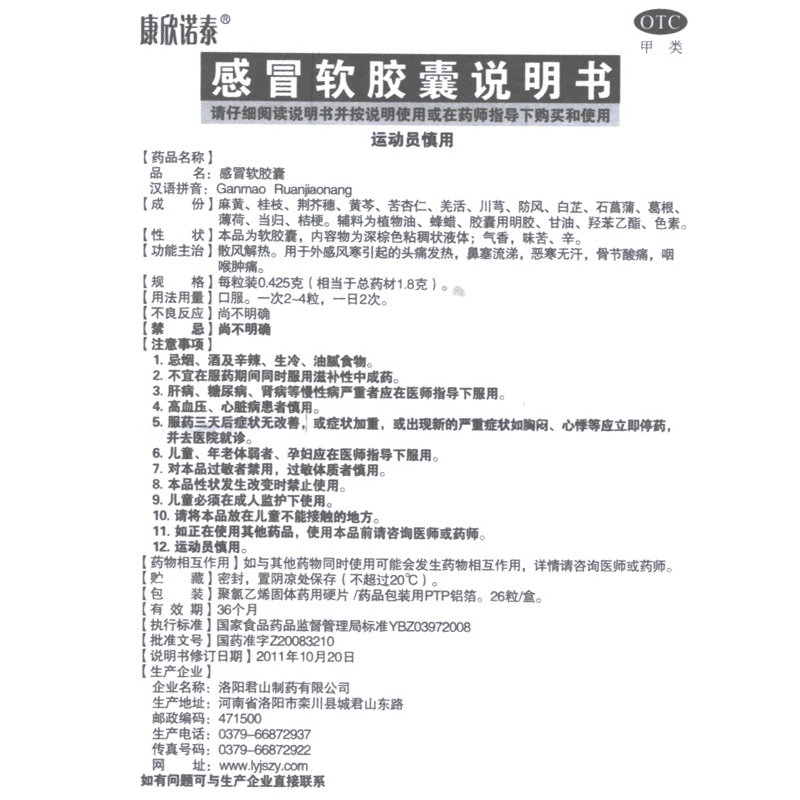 产品名称 君山 感冒软胶囊 0.425g*26粒