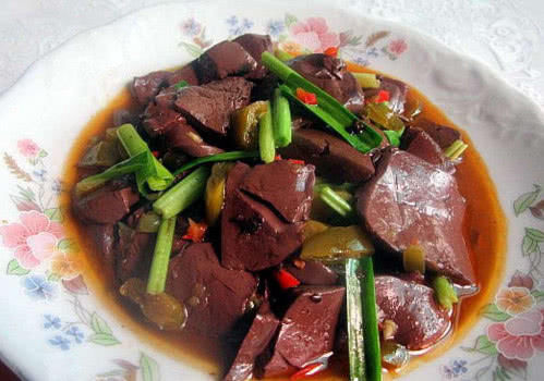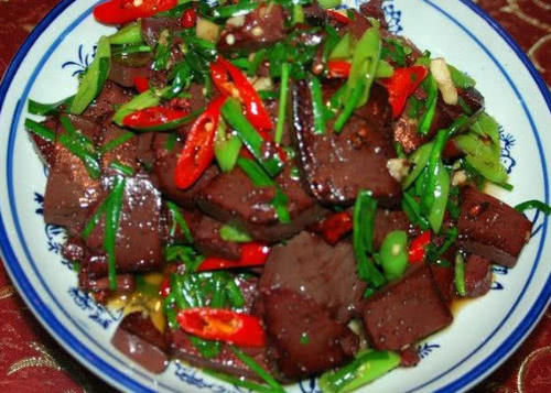 材料:猪血1块,青椒适量,盐和料酒少许,蒜末适量