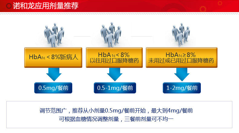 【用法用量】 瑞格列奈片应在主餐前服用(即餐前服用)。在口服本品30分钟内即出现促胰岛素分泌反应。通常在餐前15分钟内服用本药.服药时间也可学握在餐前。0-30分钟内。请遵医嘱服用瑞格列奈片。剂量因人而异,以个人血糖而定。推荐起始剂量为O.5毫克,以后如需要可每周或每两周作调整。接受其它口服降血糖药治疗的病人转用瑞格列奈片治疗的推荐起始剂量为1毫克。最大的推荐单次剂量为4mg.进餐时服用。但最大日剂量不应超过16mg。对于衰弱和营养不良的患者,应谨慎调整剂量。如果与二甲双胍合用.应减少瑞格列奈片的剂量。尽管瑞格列奈主要由胆汁排泄,但肾功能不全的患者仍应慎用。