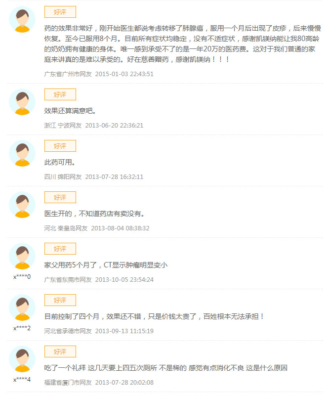 1.药的效果非常好,刚开始医生都说考虑转移了肺腺癌,服用一个月后出现了皮疹,后来慢慢恢复。至今已服用8个月。目前所有症状均稳定,没有不适症状,感谢凯镁纳能让我80高龄的奶奶拥有健康的身体。唯一感到承受不了的是一年20万的医药费。这对于我们普通的家庭来讲真的是难以承受的。好在慈善赠药,感谢凯镁纳!!!