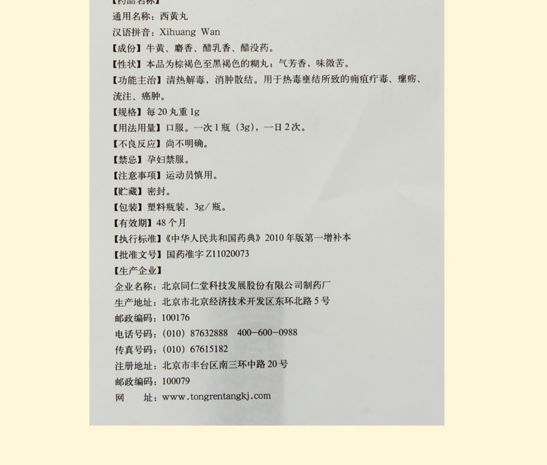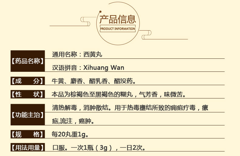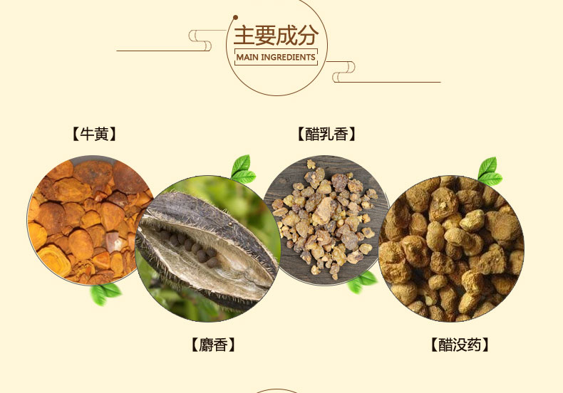 【主要成份】 牛黄、麝香、乳香(醋制)、没药(醋制)、。